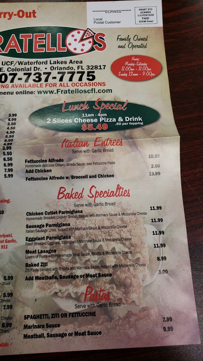 Welcome to Fratellos Pizza, a hidden gem located at 11660 E Colonial Dr, Orlando, FL. This well-loved pizzeria has earned rave reviews, consistently delivering a pizza experience reminiscent of New York. With a menu that highlights their exceptional cheese, rich sauce, and perfectly baked crust, Fratellos is truly a pizza lover's paradise.